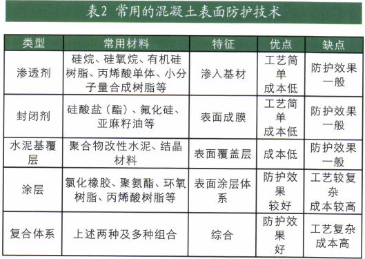 常用的混凝土表面防护技术比较见表2。