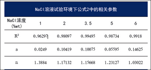 通过对试验数据进行分析,失重与时间的关系符合幂指数规则:(△W=atn)( 公式2)。式中,△W 是单位面积的腐蚀失重, g /m2;t 是试验时间,h;a 和n 是常数,n 值常作为腐蚀速率或锈层保护性好坏的参考。R2 是相关系数。