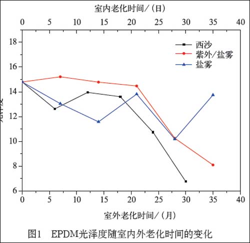 光泽度分析:光泽度是反映材料表面光学性能的重要参数, 用于定量描述材料表面镜面反射能力的大小,它能灵敏反映橡胶表面老化情况。光泽度随室内外老化时间的变化如图1 所示。