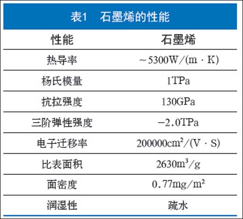 单层石墨烯其厚度仅有0.335nm,是构成零维富勒烯、一维碳纳米管及三维石墨的基本单元,如图1 所示。石墨烯是至今发现的厚度最薄和强度最高的材料。薄是因为石墨烯是由一个碳原子层构成的二维晶体,厚度只有一个原子。虽然薄到极致却非常致密,即使原子尺寸最小的氦也无法穿透它。完美的杂化结构、大的共轭体系等使石墨烯具有突出的力学性能、高的热导性、高的比表面、高的电子迁移速率等优异的性能,如表1 所示。可以对石墨烯进行改性调变其结构和性能,形成氧化石墨烯(GO)、石墨烷、氮化石墨烯及氟化石墨烯等多种衍生物。由于石墨烯和石墨烯衍生物具有多种优异的性能,使其被广泛应用于涂料、复合材料、催化、电极材料、传感器、储氢材料等多个方面。科学界都在关注石墨烯的研究进展。可以想象这种神奇的材料一旦投入实际应用将会给人类社会带来革命性的变化。