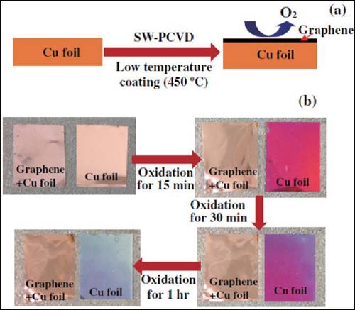 图2 (a) SW-PCVD法在铜箔表面制备石墨烯防氧化涂层的原理图