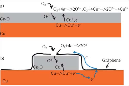 图4 铜表面的电化学氧化现象(a)无石墨烯薄膜覆盖,(b)有石墨烯薄膜覆盖