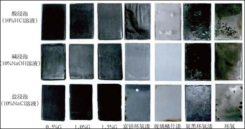 黄坤等以石墨烯粉体为填料,环氧E-44 为成膜物,研制了一种环氧复合防腐导电涂层,对比了不同石墨烯含量的复合涂料与纯环氧涂层、炭黑环氧涂层、环氧富锌涂层、玻璃鳞片涂层的导电和防腐等方面的性能。图5 为涂覆不同涂层的钢样分别在酸、碱、盐溶液中浸泡30d 后的腐蚀情况图片。从图中可与看出,环氧富锌涂层在强酸中很快就失效了;玻璃鳞片涂层在盐酸溶液中也出现了鼓泡现象;纯环氧样品在酸碱、强碱和盐的环境中均会出现薄弱区的腐蚀,如边角等区域,同时出现气孔;球形的炭黑填料对腐蚀介质的隔绝是不够严密的;而纳米柔性的石墨烯片层结构, 在隔绝性上表现得很突出,可以很好的阻碍了腐蚀介质蔓延和侵蚀。纳米石墨烯强化了环氧的防腐性能,并且比传统的碳系导电填料具备更好的物理隔绝性能。