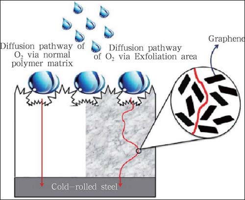 图6 腐蚀介质通过环氧树脂/石墨烯复合涂层示意图