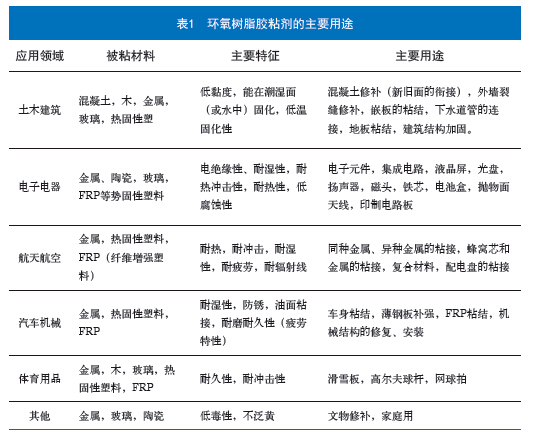 环氧树脂胶粘剂的主要用途如表1 所示。