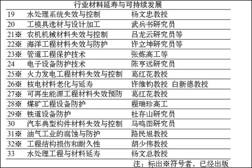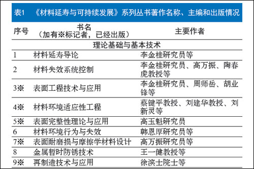 整套丛书由三部分组成:一是“材料延寿的理论基础与基本技术”部分,包括材料延寿导论、材料失效的基本理论、材料防护的基本技术等,目前包括9 个分册;二是“材料的合理选用” 部分,包括主要的金属材料、无机非金属材料、高分子材料和复合材料在工程设计中的合理选用,目前包括9 个分册;三是“行业材料延寿与可持续发展”部分,介绍包括机械、电力、油气管网、建筑、矿山、交通等材料应用的主要行业和领域中,材料失效的形式、特点、预防与控制;目前包括15 个分册。总供完成了19 册专著的出版(参见表1)。在编写出版过程中,由于各种原因, 有六册没有进入丛书系列。由出版社另外安排出版(参见表2)。