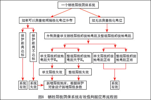 由于城镇燃气管道大多位于繁华的城区,管道上方常为建筑物或道路,常常无法直接进行密间隔极化电位的测试。在这种情况下,如何来判断牺牲阳极阴极保护系统的有效性呢?本部分结合牺牲阳极的工作原理和服役参数随时间的变化,提出了基于极限接地电阻的燃气管网牺牲阳极有效性判据。由于牺牲阳极的消耗及表面状态的改变,都可以直接体现在其接地电阻变化上,同时该参数在实际生产中便于测量,因此对于不便于直接测量极化电位分布的情况,可以用来了判断牺牲阳极阴极保护系统有效性。所提出的牺牲阳极阴保系统有效性判据应用流程图如图8 所示。