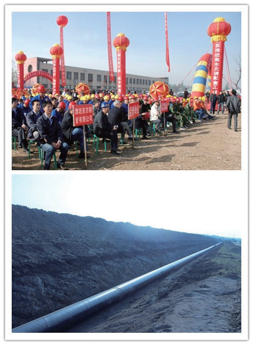 大口径输水管道TPEP 防腐工艺( 内EP 外3PE) 是结合热固性环氧树脂粉末涂料与聚乙烯特性以及加工工艺后,将三层结构聚乙烯涂层与熔结环氧粉末涂层技术巧妙结合,为埋地钢管的腐蚀防护提供了最佳方案,内壁熔结环氧树脂粉末(FBE)防腐,解决了管道的内防腐问题,管道糙率小、内壁光滑、水力性能良好。通过设计实例分析得出:与同管径管材相比,采用内壁熔结环氧涂层的管路损失可以降低30%以上;在输送相同流量的情况下,其管径可以减小一级,从而降低了成本,减少了能耗。已成为市场上广泛应用的一种大口径输水管道的主流产品。在国内南水北调配套工程、APEC 峰会北京怀柔雁栖湖生态供水、冬奥会申办会场崇礼滑雪场国家重点项目中得到应用。