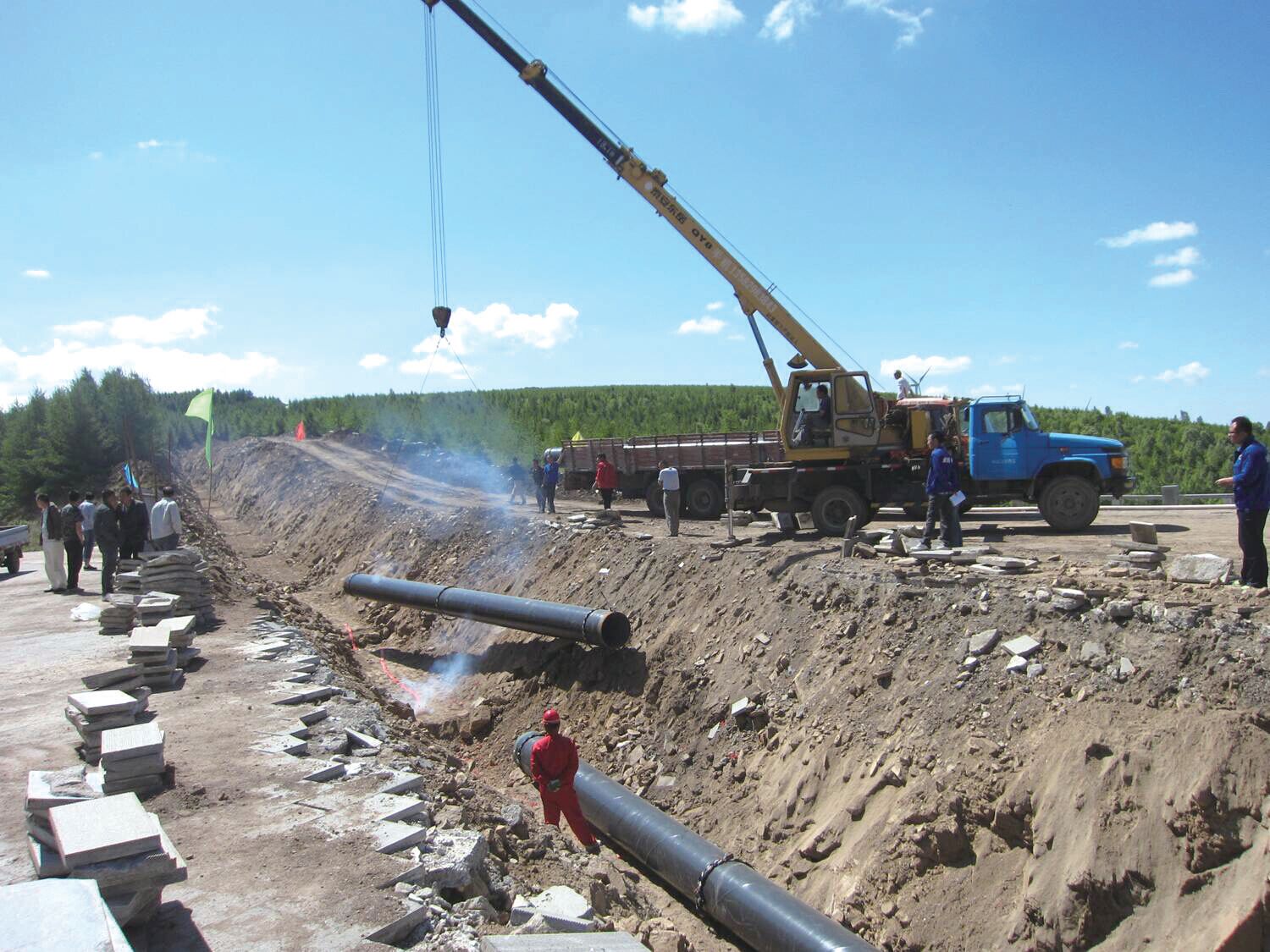 二、钢管挠度大,遇沼泽、河道等特殊环境下,遇到地下水位高时,可采用沟上焊接,提高施工效率,降低施工成本