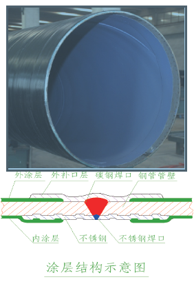 外壁采用热熔结缠绕工艺底层环氧树脂、中间层胶黏剂、外层聚乙烯形成三层结构的防腐层,内壁采用热喷涂环氧粉末防腐方式,将粉末经高温加热熔结后均匀地涂敷在管体表面上,形成钢塑复合层, 极大提高了涂层附着力及涂层厚度,增强了耐磕碰,耐腐蚀的能力。