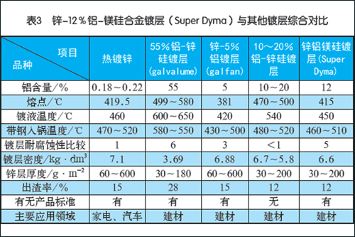热镀锌板生产历史悠久,可广泛应用与汽车、家电、建材各个领域;锌-5%铝镀层板(galfan)的耐腐蚀性比热镀锌板好, 目前在中国内主要是应用于钢丝热镀行业;55%铝-锌硅合金镀层板(Galvalume)的耐腐蚀性比热镀锌板、锌-5%铝镀层板(galfan)都好,但生产成本较高;把正宗的55%铝-锌硅合金镀层板(Galvalume)的铝含量由55%下降到 10~20%,耐腐蚀性还不如热镀锌版,此产品无标、无牌不被市场认可;锌-12%铝-镁硅合金镀层(Super Dyma),是国际品牌产品。此合金熔点低,其生产工艺与热镀锌相当,镀液工作温度为450~460℃;此合金出渣率低,与目前各企业追求的无标无牌产品锌-10~20%铝-硅镀层相当,出渣率仅为10~12%;此合金耐腐蚀性能好,与国际名牌产品55%铝-锌硅合金镀层板(Galvalume)相当。