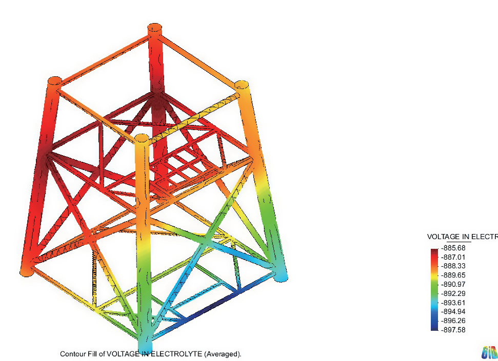 外加电流阴极保护系统优化设计的方法有两种:数值模拟法和缩比模型法。数值模拟法是在传统阴极保护设计基础上,利用计算机边界元程序求解描述阴极保护电场的偏微分方程,进而得到阴极保护的最佳化设计,预测被保护构筑物表面电位分布,图1是笔者对渤海湾内某一在役平台数值模拟的结果。阴极保护电位分布数值计算模型多是针对稳态分布型模型展开,而实际的阴极保护体系状态是随时间发生变化的,如阴极极化过程中钢表面钙质沉积层的沉积与覆盖是一个动态过程,因此边界条件中阴极表面电位与电流密度函数随时间会不断变化,仅根据某一时刻的电位与电流密度函数关系描述整个阴极极化过程,结果的可靠性和可信度难以保证。