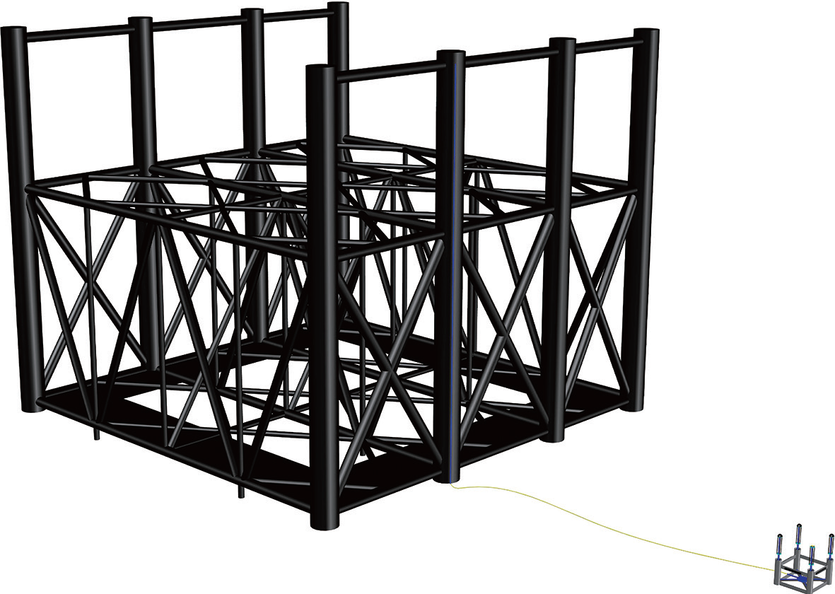 远地式辅助阳极系统是将辅助阳极放置在导管架外侧一定距离的海床上,通过脐带电缆电连接到平台上部的电源模块实现对导管架水下结构的腐蚀控制,安装方式见图4。根据保护电流和保护电位分布均匀性的需求可以同时在导管架底部海床上同时布置多座辅助阳极,通过数值模拟计算软件或者物理模型试验优化辅助阳极间及辅助阳极与导管架间平台的相对距离和角度。