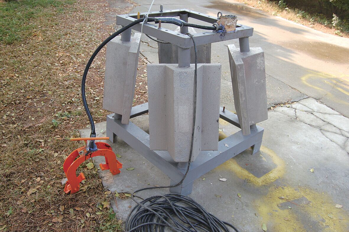 为克服这一问题,笔者单位与海洋石油工程股份公司合作开发了一种可水下安装的快速链接牺牲阳极,如图5。该系统有便携式卡箍、阳极堆及必要的电缆组成。电缆一端电连接阳极堆,另一端连接便捷式卡箍。只需操作人员将被保护管段推入卡箍环内,旋紧顶针即刻实现牺牲阳极与被保护体的电连接。该卡箍水下安装,简单便捷,目前已在码头钢管桩阴极保护延寿修复中获得应用。
