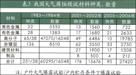 “大气腐蚀站网”根据国家需要,组织大规模投样有三次,分别在l983~1984年、2001~2002年和2005~2006年期间进行,各类试样种类、数量见表3.