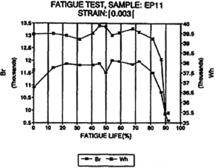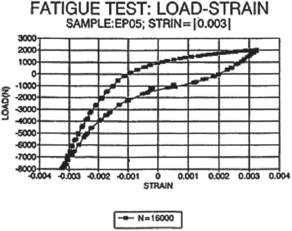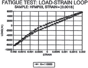 疲劳试验最初是在从0.0015到0.007不同应变等级下进行。在一个预设置的疲劳循环数后获得机械滞后回线。这些回线可用来确定疲劳试验是在低周载荷下进行还是在高周载荷下进行,观察回线的变形还可以用来发现宏观裂纹形成的开始。从图1中可以看出在16000次应力循环之前宏观裂纹开始扩展。如图2在更小的应变幅0.0018下,在高周疲劳测试实验中,宏观裂纹形成在110000次应力循环之前。