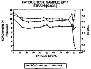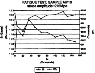 在整个疲劳寿命期间测试材料的磁性能。图3和图4的结果表明:在疲劳寿命早期阶段,作为疲劳软化结果,矫顽力适当降低。然后矫顽力和其他磁滞特性参数在绝大多数疲劳寿命保持稳定。这个稳定区域占寿命的80-90%。最后10-20%的寿命,磁滞参数急剧变化。根据载荷的轮廓,最后阶段对应宏观裂纹形成,伴随一个需要获得一个恒定应变幅的载荷下降。期望主体显微结构在初始疲劳软化之后是稳定的,疲劳中间阶段磁性参数无变化与这一解释一致。