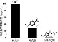 海洋藻类,无脊椎动物和陆地植物也是生物防污剂的重要来源。红藻(Delisea pulchra)分离的卤代呋喃酮化合物具有很强抗金星幼虫附着活性[15];绿藻(Caulerpa prolifera)提取的萜类次级代谢产物对海洋细菌和微藻具有防污作用[16];大叶藻中分离的p-肉桂酸硫酸酯能有效地抑制海洋细菌和纹藤壶附着[17];圈扇藻(Zonaria diesingiana)中提取的间苯三酚类化合物也具有明显的抗菌效果[18];海绵中提取的吡喃、甾体硫酸盐、嘌呤碱、酰胺及呋喃萜类次级代谢物,均具有一定的防污作用[19];珊瑚中分离获得的二萜类物质和开环甾族化合物具有抑制纹藤壶幼虫附着的作用[20];陆生植物特别是中药材中分离提取的丹皮酚、五倍子鞣质、千金子甾醇、齐墩果酸、香豆素内酯等也具有明显防污效果。中船重工七二五所从孔石莼分离得到的神经酰胺类化合物,作为信号分子具有诱导细胞凋亡的作用,对海洋污损生物的附着具有显著抑制作用;从中药材中获取的丹皮酚及其改性产物对硅藻、石莼孢子和藤壶幼虫等污损海生物的有效抑制浓度达1μg/ml,防污活性远高于铜离子(图2)。