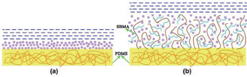 两种聚合物膜的结构及表面水分子分布示意图。 (a) PDMS,(b) SBMA,其中结合水以圆点代表,体相自由水用虚线表示