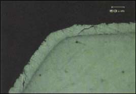 (6)铍层厚度均匀性好且可以准确控制。镀层厚度只取决于工艺过程,与构件的形状和不同位置无关。对形状复杂构件如螺纹、盲孔、内壁或凹槽等部位,通过控制规范即可获得在20-llOm之间变化渗层,且厚度几乎相同。(如图1)
