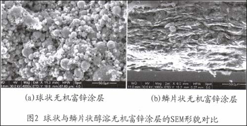 (1)鳞片基瓦状面与面搭接结构优于球锌基结构的点与点接触,使得电流导通性大大增强,并且可以在降低鳞片状锌粉含量的同时,获得优异的电化学保护性能。球状锌粉和片状锌粉的SEM形貌对比如图1所示,含球状与鳞片状锌粉的富锌涂层的SEM形貌对比如图2所示。