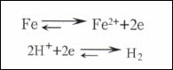 如果在一个电极表面进行着两个或两个以上的电极反应时,这种电极系统也能达到一个相对稳定的状态,此时的电极电位称之为非平衡电极电位E(亦称稳定电位)。例如,铁放入稀酸溶液中的情况如图5所示。