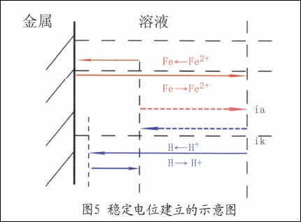 如果这一对耦合的电极反应中,阳极反应是金属材料的阳极溶解(见图5),其结果导致金属(Fe)的腐蚀破坏。在腐蚀领域中,经常涉及到的是非平衡体系,非平衡电极电位在腐蚀及其控制的研究中有着重要的意义。