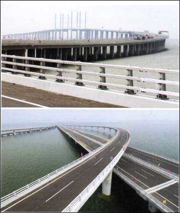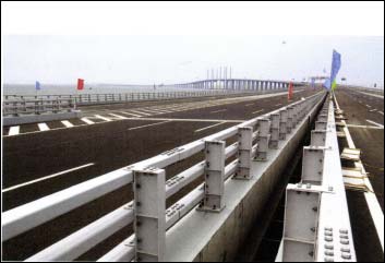 胶州湾大桥使用的护栏,在我国是最高级别的,安全绝对有保证。公司很早就开始了对大桥护栏安全性的研究和试验,进行了集装箱车辆撞击大桥护栏的试验,用载重50t左右的集装箱车辆去撞击护栏。结果显示,即便是护栏变形,车辆也不会翻进海里。
