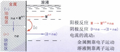 腐蚀电池的工作原理与—般原电池相同,如图2所示。阳极(区)上发生失去电子的氧化反应(阳极反应),电位相对较低,是电池中的负极,也是发生腐蚀的地方。阴极(区)上发生接收电子的还原反应(阴极反应),电位相对较高,是电池中的正极。腐蚀电流Ic的流向是指正电荷流动的方向,电流从阳极流出进入溶液中,再从溶液中流入阴极。