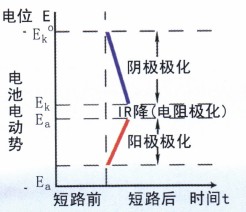 式中Ek°为阴极(铜)的开路电位;Ea°为阳极(锌)的开路电位;R为电池系统的总电阻。当电流瞬间达到最大值后,随时间的增长电流却很快减小,最后稳定在一个较小的电流值。从欧姆定律可知,影响电流强度I的因素有二,电池两极间的电位差和电池内外电阻的总和R。电池接通,总电阻R并没有变化,那么电流I的减小只能是电池两极间的电位差降低的结果。实验测得的情况也完全证明了这一现象。