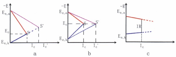 ② 阳极控制的腐蚀过程。如图9a所示,这类腐蚀,阳极极化曲线很陡,阳极反应阻力大,控制着腐蚀速度。如溶液中能形成稳定钝态的金属和合金的腐蚀就是阳极控制腐蚀过程的典型例子。破坏钝态的各种因素均促进腐蚀的阳极反应,从而导致腐蚀显著增大。③混合控制的腐蚀过程。如图9b所示,如果体系的欧姆电阻可以忽略,而阴极极化和阳极极化的程度相差不大,腐蚀受阴、阳极混合控制。例如铝和不锈钢在不完全钝化的状态下的腐蚀属此类。