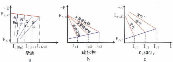 仅举几例,如图10所示。锌在稀硫酸中的腐蚀见图10a。在锌上析氢过电位高,反应阻力大,属于阴极控制腐蚀。如Cu作为杂质在锌中存在,由于Cu上氢过电位比Zn上的要低,使析H2反应容易,从而增|大了Zn的腐蚀。而Hg上氢过电位要比Zn上的高,所以Hg在Zn中存在,使氢的析出更困难,从而降低了锌的腐蚀即:IC(Hg)< IC (Zn)< IC (Cu)