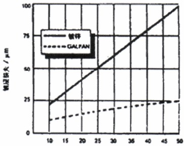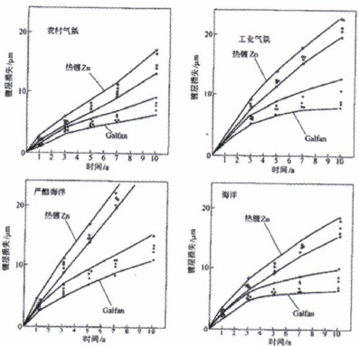 日本Nisshin钢铁公司将常规热镀锌板和Ga1fan镀层板在农村、工业气氛、海洋、严酷海洋等四种大气环境下,进行了10年的暴露试验。试验表明,热镀锌的腐蚀失重与时间呈线性关系,而Ga1fan镀层在腐蚀初期为线性,随着时间的延长,其腐蚀失重与时间呈抛物线关系,见图1。