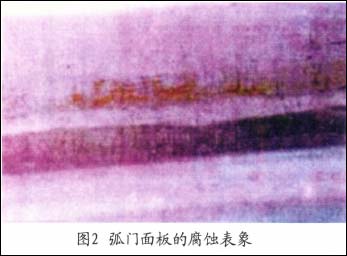 某一水利工程中的弧形闸门,闸门的中心线以下为不锈钢复合板,以上为碳钢,碳钢表面采用喷锌与涂料复合保护体系。投入使用两年,每年的洪水期有一个月的时间,水位超过中缝,中缝处的腐蚀情况如图2所示。
