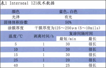该涂料有蓝色(冬用型)和白色两种颜色,有光泽,体积固体份数为50%.典型干膜厚度为125~250μm,相当于250~500μm湿膜厚度。可采用无气喷涂、空气喷涂、刷涂等方式进行涂覆。喷涂后,干燥1h后便能剥离下来。Intersea1 121技术数据如表1所示。