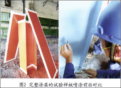 试验需要高压无气喷涂机一台(含喷枪等附件),搅拌器一个,电磁和涡流干膜测厚仪、摇杆湿度测量仪、焊机、动力打磨工具、记号笔、壁纸刀、废铁块、帆布、米尺、水。喷涂前需用水对喷漆泵进行清洗。试验共需要制备5块标准试验样板和1块小样板,标准样板需要板材2块(规格最好为1500mm×400mm),H型钢2块(常用型号长度在1200mm左右,规格最好为H300×300和H300×150),管材1块(长度在1200mm左右,规格最好在4″以上),小样板用于做水浸泡试验,仅需要长度200mm×I00mm板材即可。试验样板喷砂除锈的表面应符合SSPC一SP 10标准,然后进行底漆、中漆、面漆喷漆,如图2所示。