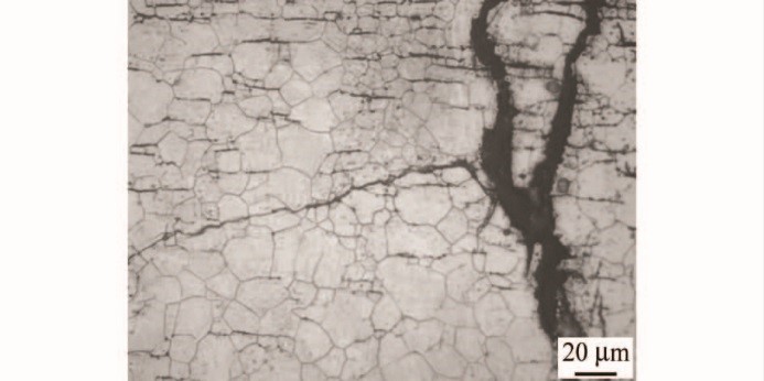 根据国内外核电厂多起失效案例,非敏化不锈钢晶间应力腐蚀开裂部件的共同点是部件整体或局部发生了应变硬化。在管材及插塞基材显微组织中未观察到滑移带,表明材料的真应变小于12%,即插塞和管材的局部应变引起的加工硬化机制为位错强化。PWR核电厂一回路水中氧和参与化学反应的合金元素快速反应,生成的氧化物由于体积膨胀和对位错运动的阻碍使得晶界处应力进一步集中,最后导致晶界强度降低,裂纹以沿晶扩展的方式发展。