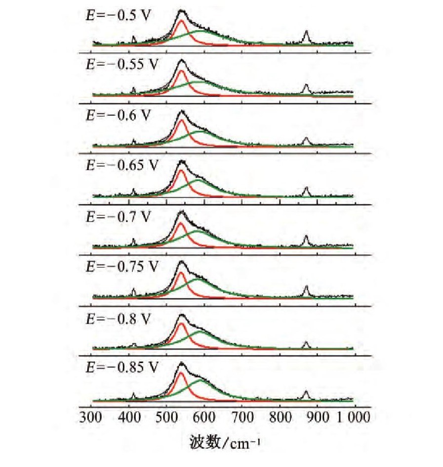 (3)600合金腐蚀氧化膜的原位拉曼光谱存在3个峰,其中540,610cm-1峰来自Cr2O3氧化膜,670cm-1峰来自FeCr2O4尖晶石产物。当样品极化电位从-0.85V增大到-0.5V时,670cm-1的相对强度显著增强,说明腐蚀氧化膜中尖晶石的相对含量发生了变化。