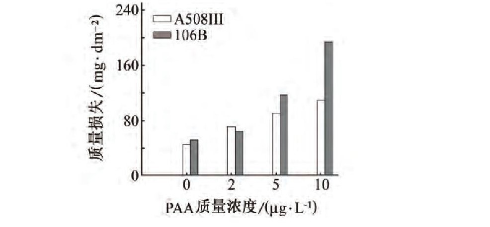 (1)PAA加入量为0~50μg/L时,试样经72h腐蚀试验后的质量损失随PAA含量的增加而降低,试样浸泡液中的铁离子含量也逐渐升高,说明加入PAA能促进铁离子的释放。