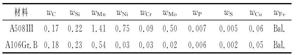 试验材料为国产A508III低合金钢和A106Gr.B碳钢,其主要化学成分见表1。采用线切割将试样割成20mm×15mm×2mm的试片,用SiC砂纸逐级打磨试片至镜面光亮,用无水乙醇超声清洗、干燥后称量备用。