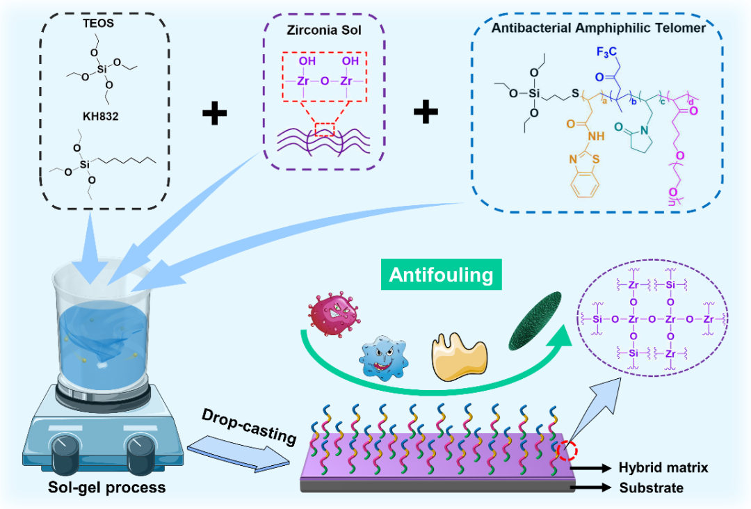 中国科学院海洋研究所海洋关键材料重点实验室、海洋环境腐蚀与生物污损重点实验室段继周团队在透明且机械耐用的海洋防污涂层方面取得研究进展。相关工作以“Transparent and mechanically durable silicone/ZrO2sol hybrid coating with enhanced antifouling properties”为题发表在Chemical Engineering Journal上。 这项研究揭示了一种新的方法,通过一种简单的溶胶-凝胶技术,通过两亲性端粒、氧化锆(ZrO2)溶胶、三乙氧基辛基硅烷(KH832)和正硅酸四乙酯(TEOS)的合并,合成一种混合防污涂层。 该涂层具有出色的机械性能,具有显著的抗菌效果。表现出优异的自清洁、防污和抗污能力,同时,具备高度透明度,可满足光学仪器、可折叠显示器和海洋设施等领域的应用需求。