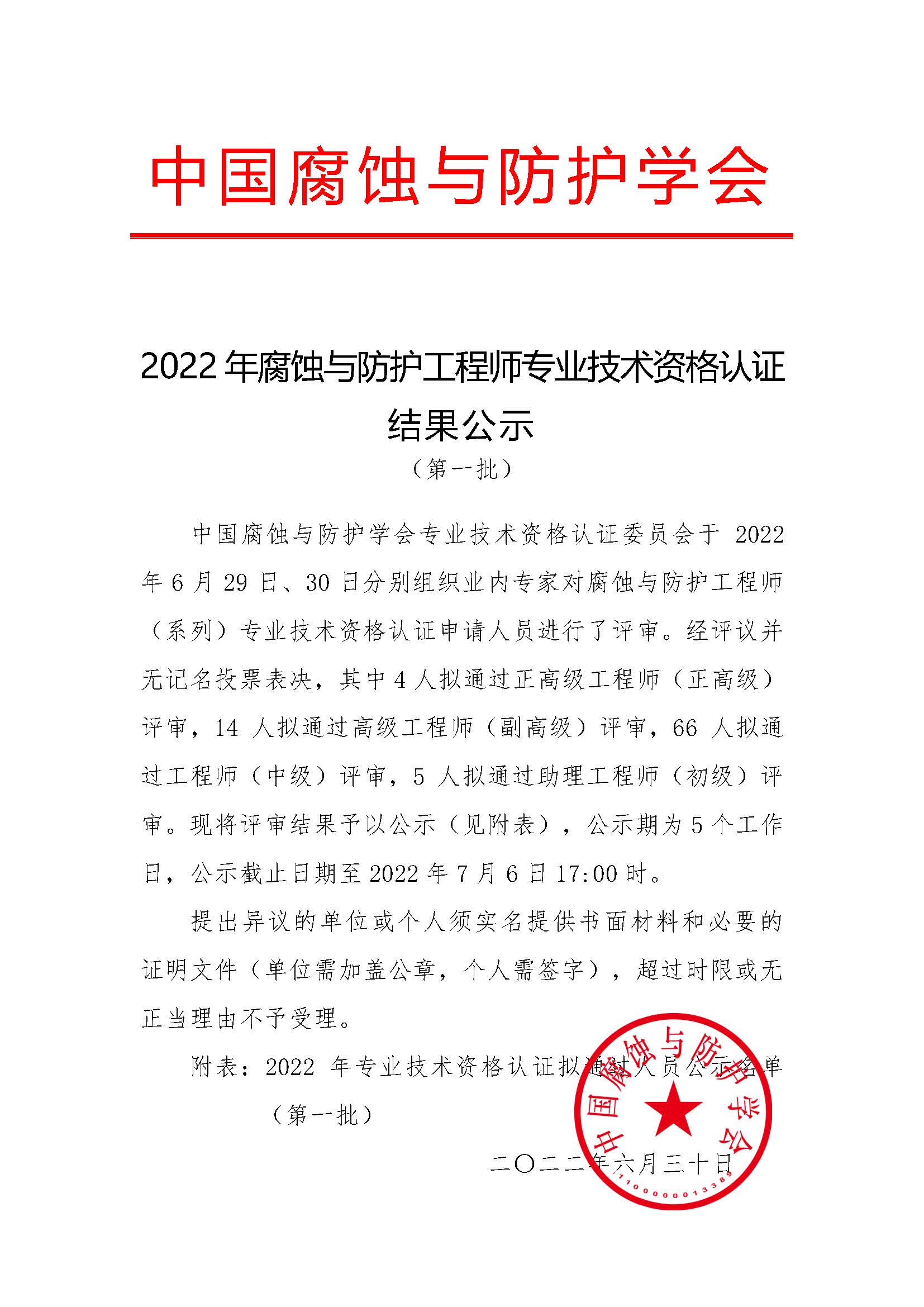 2022年腐蚀与防护工程师专业技术资格认证结果公示
