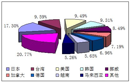 2009年我国未列名化学工业及相关工业化学产品及配制品(海关编码:38249099)主要进口国家是日本、台湾、美国、韩国、挪威、加拿大、德国、越南、马来西亚等,其中从日本进口的商品量占总进口量的比例为17.3%,而从其他国家及地区进口的商品量占比不到10%。我国未列名化学工业及相关工业化学产品及配制品(海关编码:38249099)进口国家及地区分布相对比较分散,总体来看,我国未列名化学工业及相关工业化学产品及配制品(海关编码:38249099)的进口仍然主要来自于亚洲国家及地区,从亚洲地区进口的商品量达到了总进口量的50%以上。