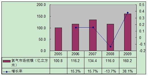 2005年,我国氦气市场规模达到100.8亿立方米;2006年,我国氦气市场规模达到116.2亿立方米,同比增长15.3%;2007年,我国氦气市场规模达到134.4亿立方米,同比增长15.7%;2008年,我国氦气市场规模达到116亿立方米,同比下降13.7%;2009年,我国氦气市场规模达到160.2亿立方米,同比增长38.1%。