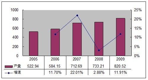 2005-2009年我国聚丙烯树脂产量保持着增长的趋势,由于受到金融危机的影响,我国聚丙烯树脂产量增速在2008年有所下降。2005年产量为522.94万吨;2006年产量为584.15万吨,同比增长11.7%;2007年产量为712.69万吨,同比增长22.01%;2008年产量为733.21万吨,同比增长2.88%;2009年产量为820.52万吨,同比增长11.91%。