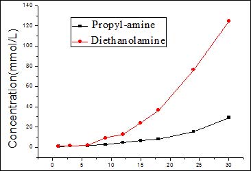 图2 不通电(上)与通电(下)情况下清液端正丙醇胺与二乙醇胺浓度随时间变化情况#p#副标题#e#
