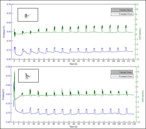 众所周知,亚稳态蚀点的成核、生长、灭亡将引起电位、电流的波动。腐蚀介质中,钝性金属(如铁、铝)表面亚稳态蚀点的生长是迅速的、不可避免的。具有自钝化特性的金属,对孔蚀的敏感性较高。Y.F. Cheng认为电位暂态峰缓慢恢复是由钝化膜电容的充放电引起的[1]。而电流暂态峰的来源类型可以由功率密度谱衰减斜率的不同分为6种[2]。其中,纯铁和低碳钢上亚稳态点蚀通常引发电流先迅速上升后指数衰减回到基线。通过理论计算,此类电流峰功率密度谱衰减斜率为-2 mA2/Hz2。Speckert等人[3]的研究表明,Ti-Al合金表面亚稳态点蚀将产生正向电流峰,Fe-Al合金表面亚稳态点蚀能产生双向电流峰。Dong等人采用电化学噪声研究了模拟混凝土孔隙液中浸泡的碳钢表面亚稳态孔蚀产生和发展与锈层的关系,该研究发现锈层可以引导亚稳态点蚀的生成,生成速率在出现宏观蚀孔以后达到最大值[4]。#p#分页标题#e#