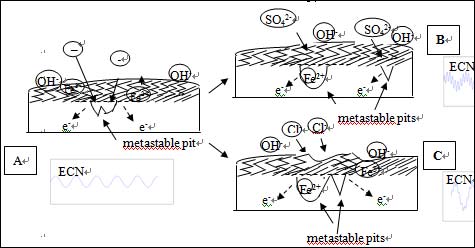 在氯化钠溶液中ECN的LLE正数的百分率小于硫酸钠溶液中。这表明当介质中含有氯离子时,氯离子优先吸附在碳钢钝化膜表面,蚀孔形成后,平衡便受到破坏,溶解占优势。同时,氯化钠溶液中LLE正数数值小于硫酸钠,表明NaCl溶液中蚀点分布的局部性。SEM图片可验证这一结果。碳钢在NaCl溶液中干湿循环48小时后可观察到明显的蚀孔。Na2SO4溶液中,样品表面积累了较厚的腐蚀产物。由EDS和XRD谱判断Q235在Na2SO4溶液中干湿循环24小时的表层腐蚀产物为γ-FeOOH, Fe2O3和FeSO4,在NaCl溶液中的腐蚀产物为无定型的铁的氧化物。循环48小时以后产物的原位Raman光谱图表明NaCl溶液中的腐蚀产物主要为Fe3O4, 由此推断NaCl溶液中的无定型产物可能为β-FeOOH。XRD和Raman光谱数据因为篇幅原因没有列出。产物类型的差别影响了点蚀的发生和分布。模型如图2。