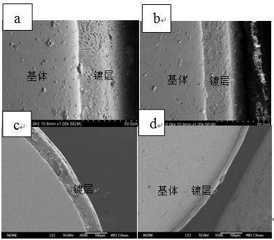 其中,a、b分别代表未加电磁抹拭,加电磁抹拭(电流为10A)的镀层同样放大1000倍的扫描照片,c、d分别代表未加电磁抹拭,加电磁抹拭(电流为20A)的镀层放大200倍的扫描照片。由以上图可以看出加上电磁抹拭后镀层明显变薄并且镀层均匀性比未加电磁抹拭的效果好。