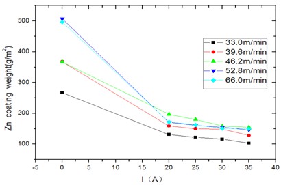 由图4可以看出,当电流在5-20A范围内,电磁场强度增加的很明显,对应于图3中上锌量下降很明显,几乎是直线下降,当电流超过20A时,电磁场强度增加但不是很明显,对应于图3中在不同的走线速度下上锌量都有一定的下降,但趋于平缓。